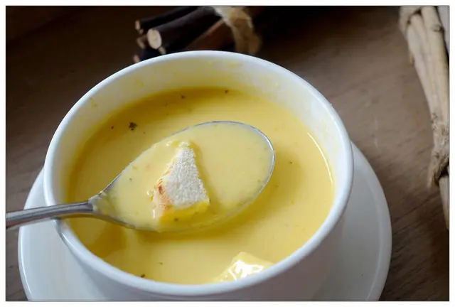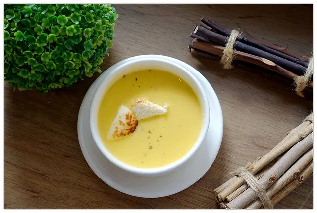 南瓜蔬菜濃湯裡有兩塊起司麵包丁~