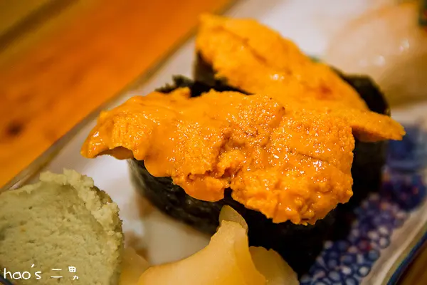 海膽、鮭魚卵、炙奶油海鱺(?)、北海道干貝、穴子、竹筴魚(?)。