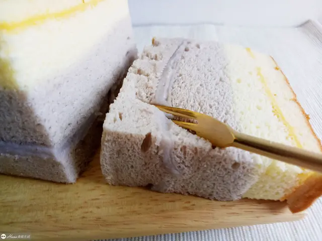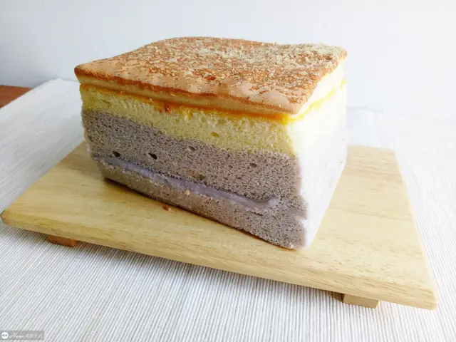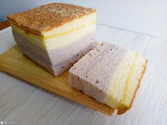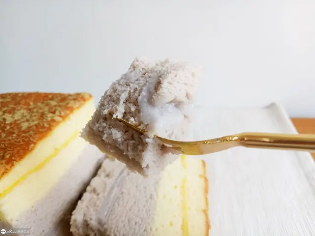 下半部蛋糕體為淺紫色的芋香口味,底部有一層芋泥