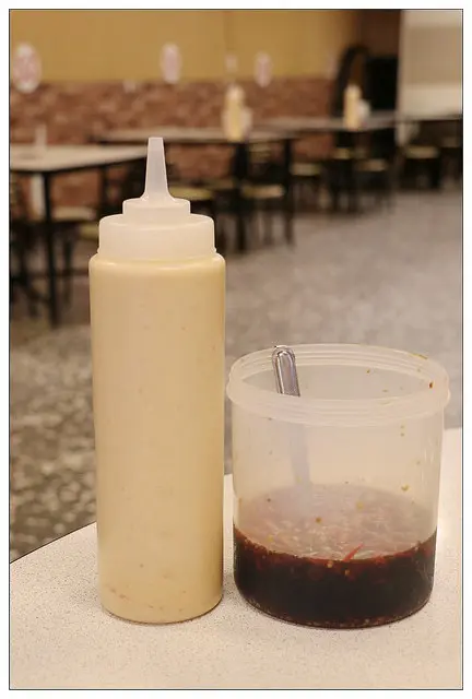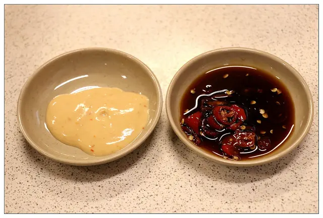 左邊是鹹香的豆腐乳醬.右邊則是辣椒醬油