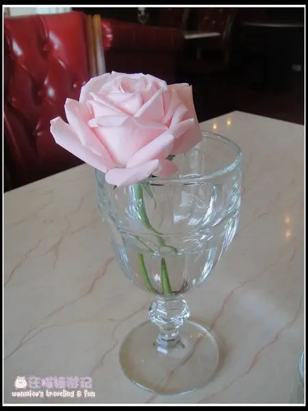 每桌都有一朵粉紅色玫瑰花,不虧是走浪漫古典風的古典玫瑰園