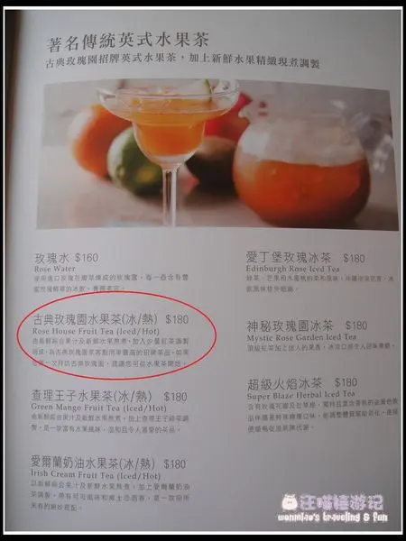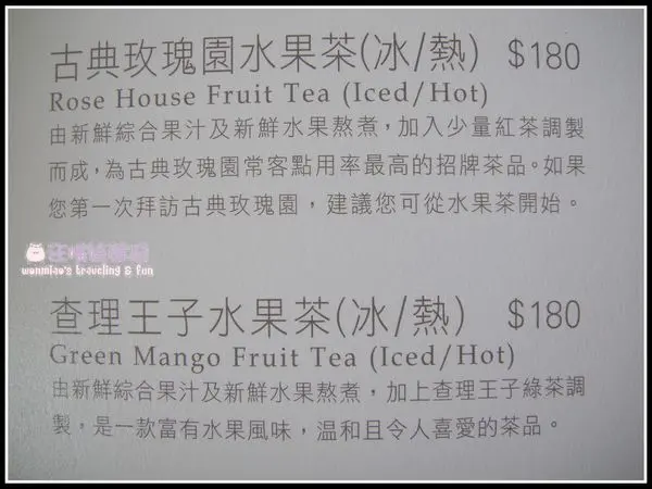 古典玫瑰園水果茶(少冰) $180 水果茶有以紅茶或綠茶為基調兩種,我選擇了點用率最高並以紅茶為基調的古典玫瑰園水果茶,果然好喝而且不會太甜,一樣比一般餐廳小壺...