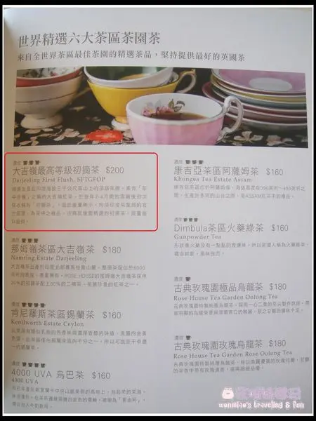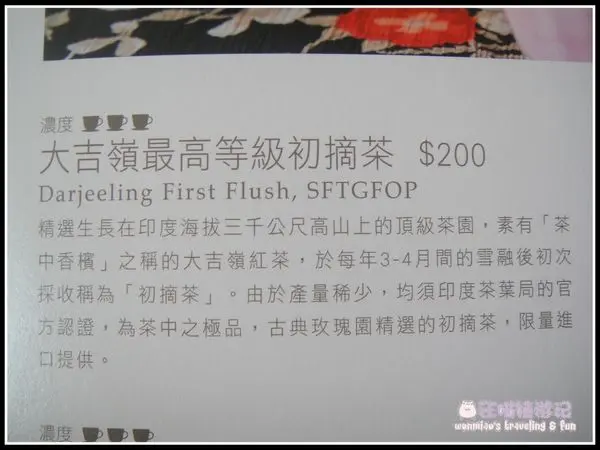 大吉嶺最高等級初摘茶 $200 這最高等級初摘茶喝來有點兒像以前喝過的滇紅,但味道比滇紅淡一些,卻又比一般紅茶味道還重一些... 但裡面沒有茶葉,不能回沖,一小壺茶倒個2杯就喝完了,感覺有點兒...如果可以回沖的話,個人接受度會高一些,也不會浪費了那些被倒掉的茶葉說...