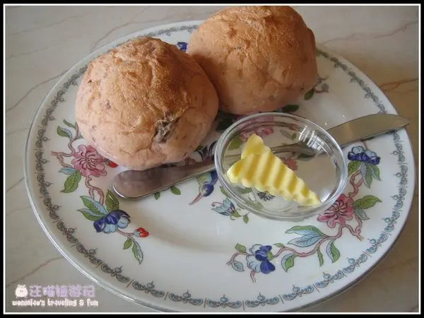 首先上來的是兩份套餐所附的餐前麵包 -- 玫瑰麵包嚼起來有股淡淡的玫瑰香氣,抹上奶油,奶油香和玫瑰互相襯托增色,又香又好吃...
