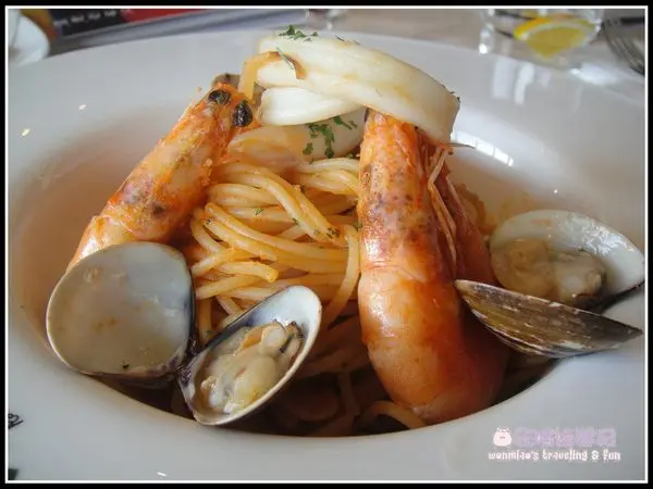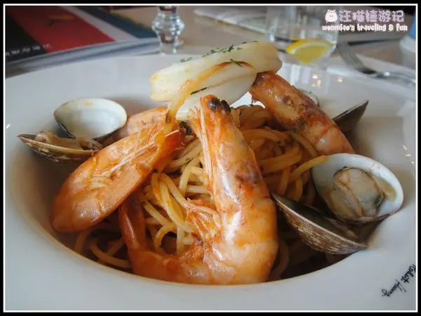 米蘭海鮮蕃茄義大利麵 盤子很大很重,但實際餐點的份量不是很多,果然是吃氣氛,吃巧不吃飽的餐廳...表現沒有多大的驚艷之處,但海鮮都還算新鮮...
