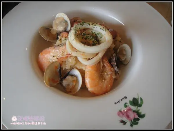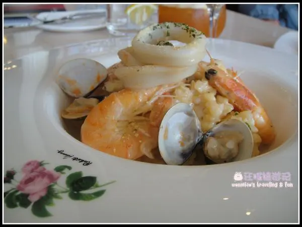 義大利海鮮燉飯 配料和米蘭海鮮蕃茄義大利麵的差不多,因為加了義式白酒奶油醬去燉煮的,米粒都改吸收了醬汁混合海鮮的精華,軟硬適中,吃來有著濃濃的奶油香,我們都一致認為比義大利麵的口味好吃!