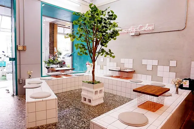 磨石子地板配上不規則形狀的磁磚座位區相當特別且吸睛