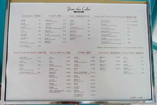 ♥咖樂–show the color♥的餐點有早午餐/漢堡/鐵板風味吐司/飲品