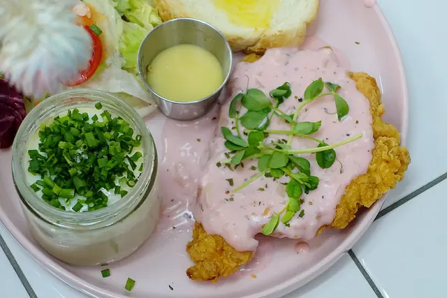 特別的粉紅色醬汁主要是以洋蔥為基底~不是的和底下的炸雞排也很搭