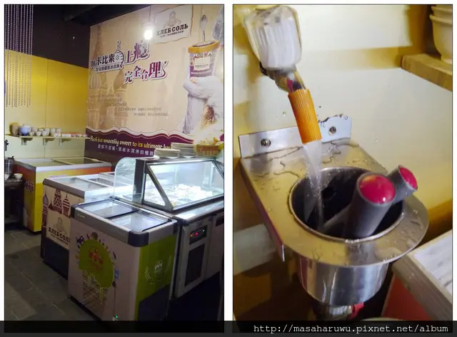 挖冰淇淋的勺子放在上方有小水龍頭的容器中~~這樣就不會所有冰淇淋口味都混合在一起~真是貼心的設計!