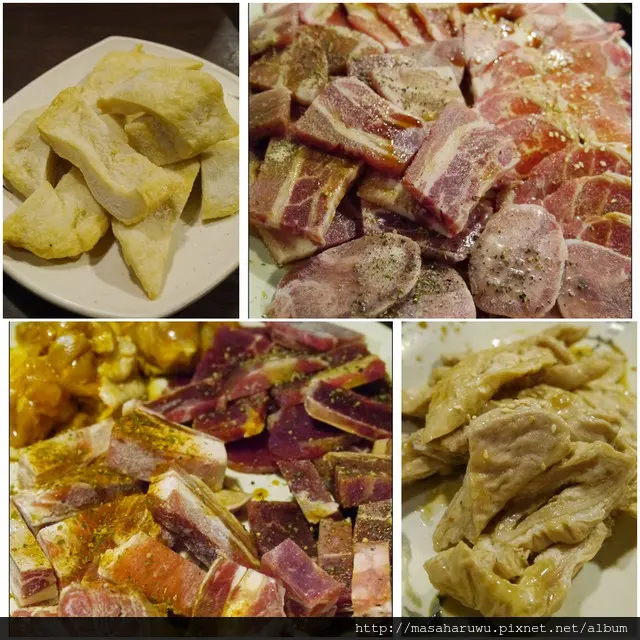 左下角的牛雞拼盤:牛五花、照燒牛五花、菲力、雞腿肉