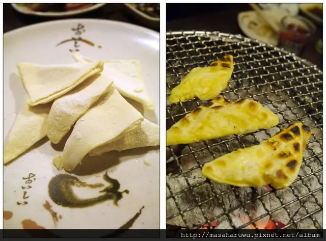 看到店員神乎其技的表演~~小菲在旁邊看的眼睛發亮~~原來烤麻糬團結在一起之後居然還會膨脹起來耶!!
