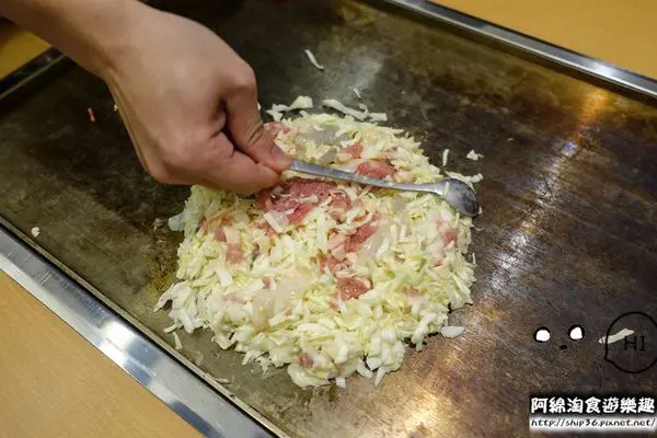 ▼【風月摩登燒】攪拌到黏稠的感覺就要把碗裡的食材倒到鐵板上,滋滋作響