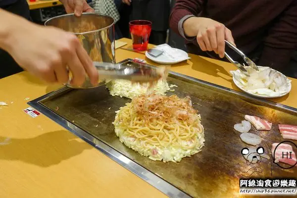 ▼【風月摩登燒】雞蛋麵已經是熟的狀態,服務人員用筷子把麵放到摩登燒上頭