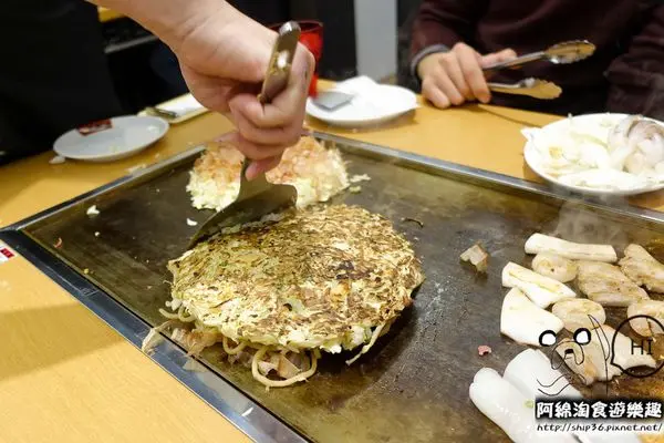 ▼【風月摩登燒】朋友很專業,因為他年輕時曾在大阪燒專賣店服務過,所以我就請他幫我切摩登燒,手很美,他用兩支小煎鏟把摩登燒先切成一半再分切成小塊,方便食用
