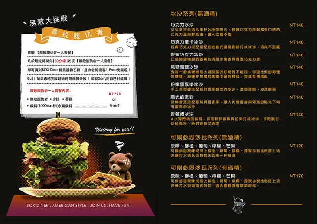 菜單在這,有趣的是有腹仇者挑戰賽喔~大胃王的你不妨可以嘗試看看