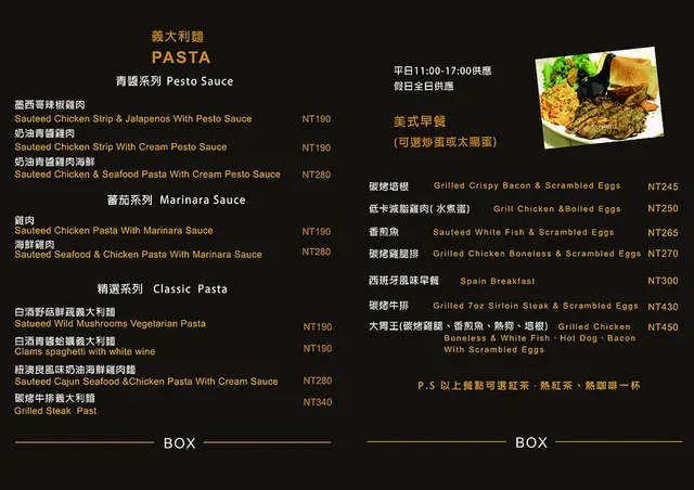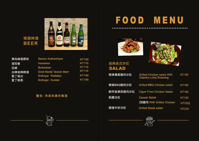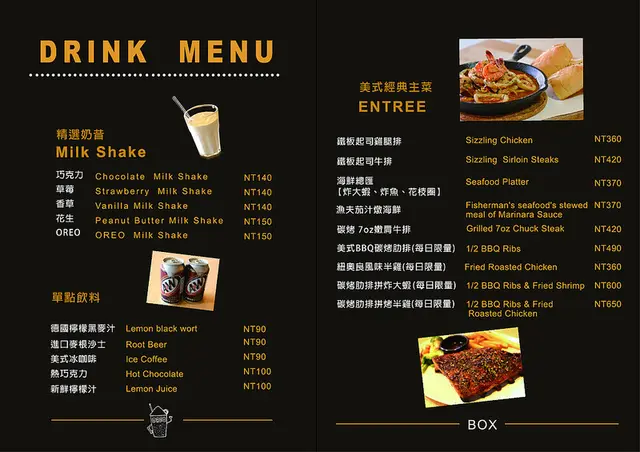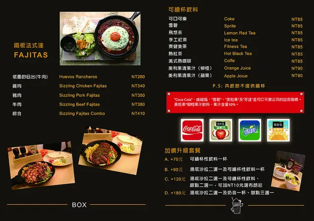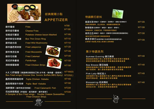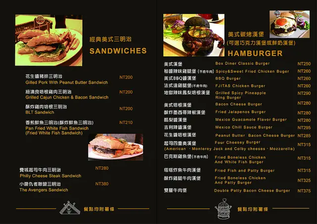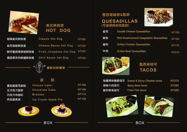 餐點以美式、墨西哥餐點為主,有開胃菜、漢堡、三明治、氣泡飲等等