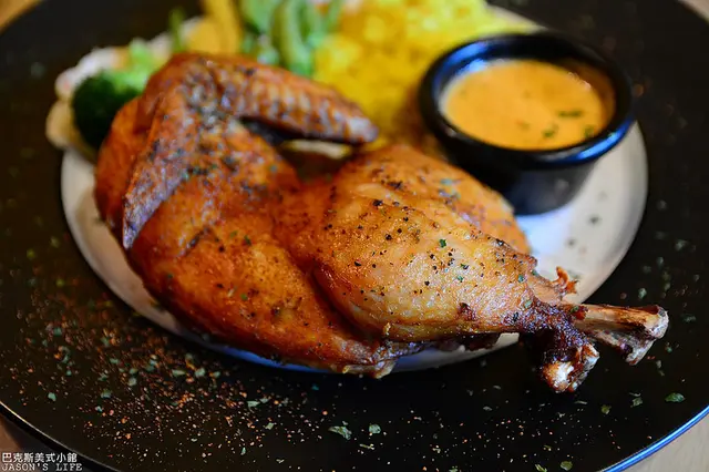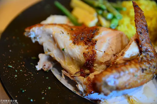 灑著香料的烤半雞,外皮烤得酥黃,看起來好美味