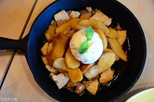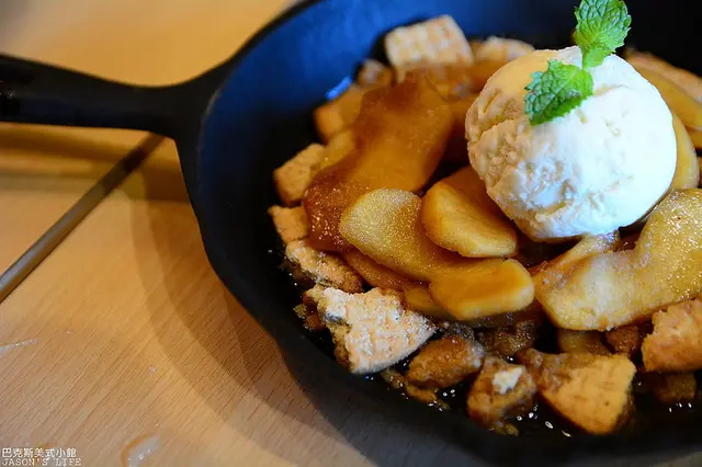 切成一片片的蘋果拌入肉桂下鐵鍋去烹調,熱熱的口感蘋果香帶出甜甜的氣味