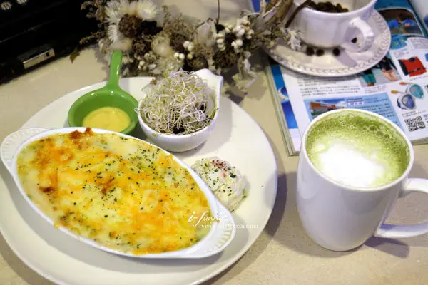 奶油海鮮千層麵 $189(附馬鈴薯生菜沙拉),京都抹茶拿鐵 $70