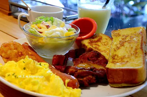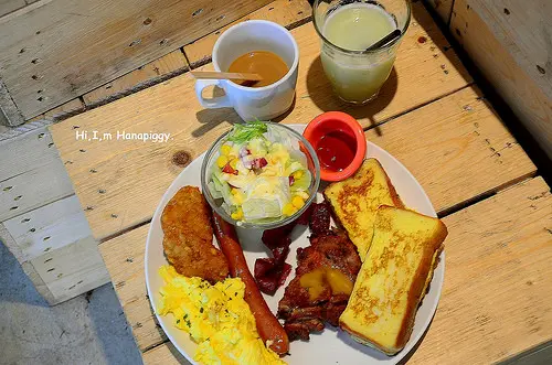 方屋經典法式早午餐($220),菜單上介紹此餐點內含香煎雞排、培根、香腸、法式土司、沙拉、牛奶起司蛋、薯餅、鮮果汁、茶或咖啡。茶和咖啡就是上述所說,需自行到櫃台旁倒取,但無限量供應,如果打算在方屋餐廳待上好一陣子的人,私心覺得點這個相當划算((大嬸精神展露無遺 ,哈哈哈哈哈,不喜歡咖啡和茶的大家也能改選其他飲料,可折抵50元。方屋經典法式早午餐($220)的牛奶起司蛋,起司味道十分濃厚,搭配滑蛋滑嫩的口感,是花小豚覺得整個套餐裡烹飪最棒的部分 。香煎雞排和培根則煎得過熟,略顯乾柴,十分可惜。方屋經典法式早午餐($220)的沙拉,份量不大,如大多生菜莎拉般,清淡爽口,多種蔬果搭配在一起,不僅營養,顏色也十分漂亮。而香腸(火腿)部分,表現中規中矩,是大家可以想像得出來的味道。方屋經典法式早午餐($220)的法式土司,微甜不膩、厚實軟嫩,但奶油香氣稍稍不足。方屋經典法式早午餐($220)的薯餅,花小豚超愛薯餅,看到套餐裡附上兩塊薯餅,我都開懷大笑了,可惜這薯餅結構太過鬆散,沾番茄醬的過程中便自行分散開來,整體而言也稍油膩。 方屋經典法式早午餐($220)的芭樂鮮果汁,一個早午餐竟然大方附上兩種飲品,方屋餐廳體貼客人的用心從中便能略見一二。巧克力經典鬆餅套餐($180,焦糖/巧克力/蜂蜜), 可任選130元內的飲品一杯,超過補差額。巧克力經典鬆餅套餐,鬆餅部分酥脆可口,飄散著淡淡的奶香,搭配店家點綴的巧克力醬,香甜順口,建議大家趁熱的時候享用,冷掉後的鬆餅美味度會大打折扣喔。【方屋餐廳】菜單:
