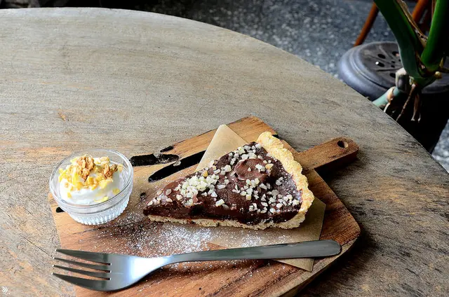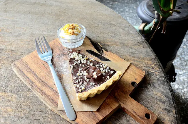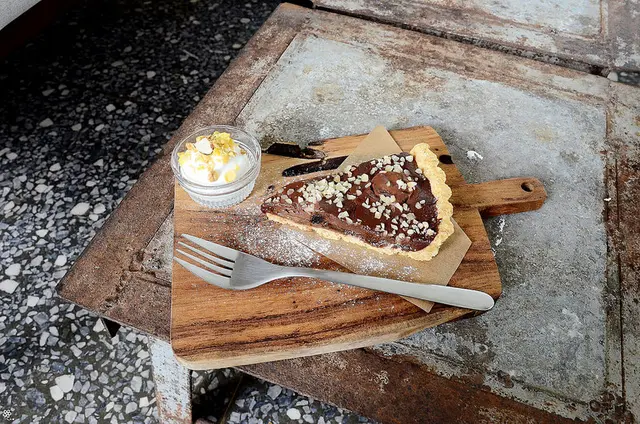 生巧克力塔上頭灑滿杏仁,增加不少口感層次,