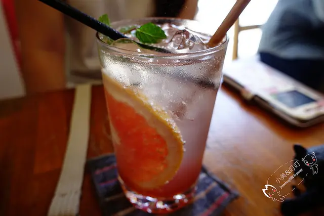 其實就是柚子汽水,基底是雪碧,底下的當然就是柚子汁了!再放入一片柚子給你戳啊戳攪拌攪拌這樣