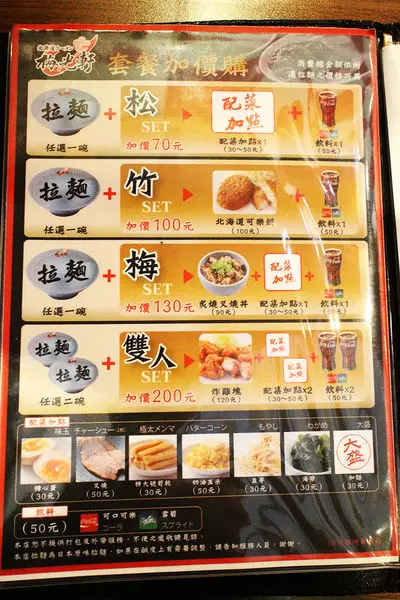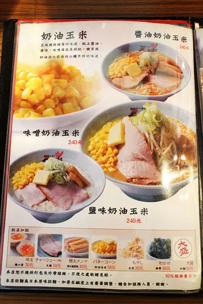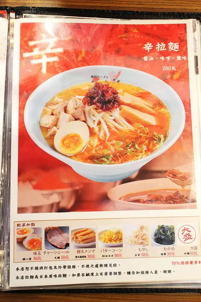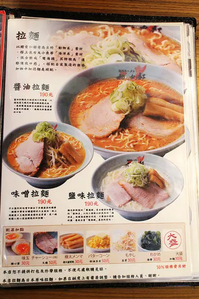 Menu蠻大一本的,有各種多樣的拉麵,價位約在$190~$260左右