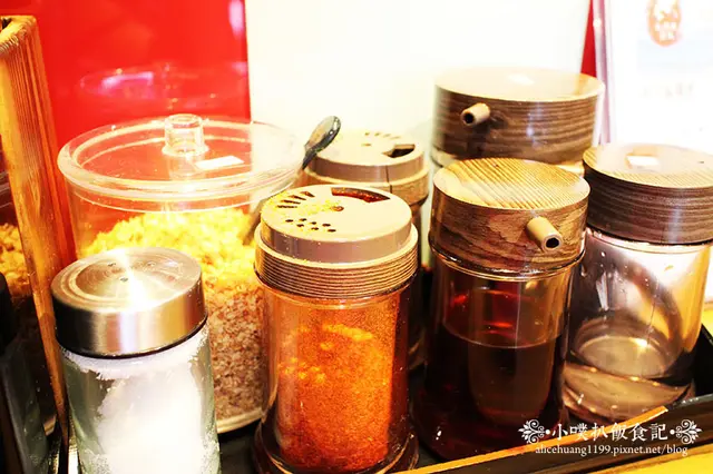 桌上擺有蒜頭末.醬油.辣油.辣椒粉.白醋..等調味料