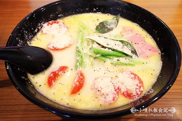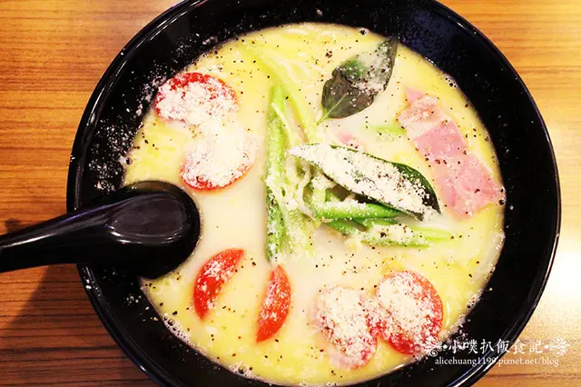 當服務員端上來,就聞到陣陣香氣撲鼻的起司香味,梅光軒推出的"春季拉麵",以豬骨.雞骨.小魚乾.昆布細心熬煮鹽味湯底湯頭,讓湯頭獨具新鮮高湯美味,而後加入牛奶.奶油.大蒜起司,大蒜起司的濃郁蒜香,讓整個湯底提升起來,再搭配牛奶的香醇奶香,有種融合中.西式的創新口味,最後並與培根.蘆筍.玉米.洋蔥一起烹煮,讓新鮮蔬菜融入於麵湯當中,有種清新自然之感,爾後再以小蕃茄點綴其上,灑上濃郁香醇的起司粉及黑胡椒粉提味,再灑上野蘿勒增添香氣,濃濃歐洲風味融入傳統拉麵中,似乎讓這道拉麵,更有米其林推薦的雙重保證!!!