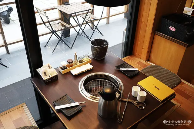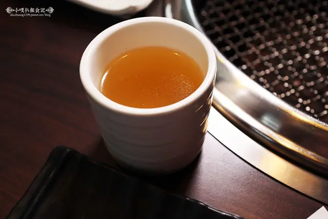 今天我們被安排在窗邊,桌面都會置放一壺店家獨家熬煮的雞湯,中間是燒烤區域,下方是瓦斯開關,店家採用無煙燒烤,所以絲毫無油煙味,空氣品質管理的相當優秀