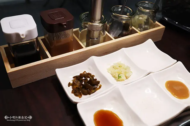 醬料有 水果醋、味噌醬、玫瑰鹽、剝皮辣椒、蔥拌洋蔥泥