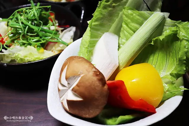 時蔬包括:香菇、黃椒、紅椒、杏鮑菇、玉米筍及包肉生菜的新鮮菜葉