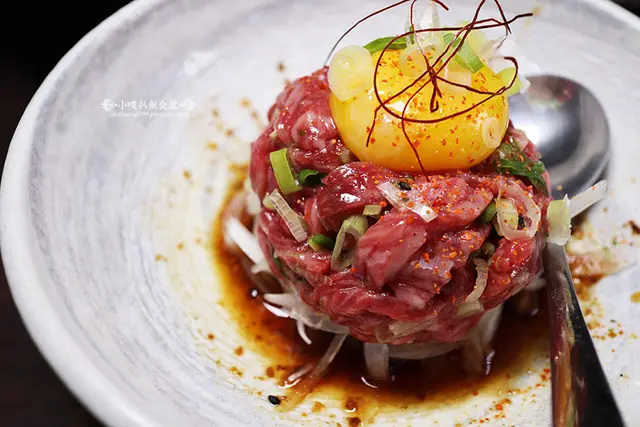 品嚐時,先將蛋黃輕輕劃破,再拌入生牛肉中,新鮮嫩滑的生牛肉,簡直軟嫩無比,入口即化的美味,搭配鮮甜的調味洋蔥及酸甜的開味醬汁,口感更加不同凡響