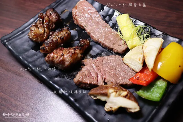 A5+ 九州和.腰脊上蓋 : 這是我最喜歡的牛肉部位,此部位肥瘦分佈均勻,口感感覺油脂及瘦肉比例相當平均,所以有肉質的香甜口感及油脂的香醇滋味,口感相當軟嫩,越嚼越是香氣十足,十足討人喜愛!!!