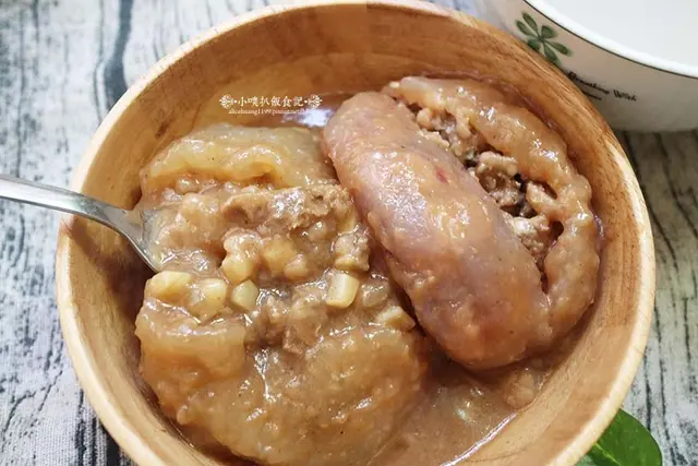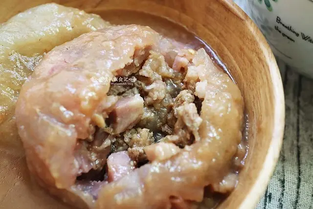 裡面有超大芋頭塊,口感綿密好吃,肉圓內餡包括後腿肉及筍塊,肉塊經過醃製,以胡椒調味,散發出飄香香氣