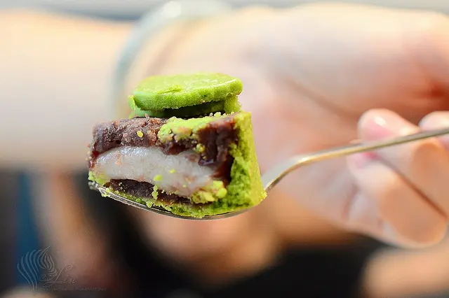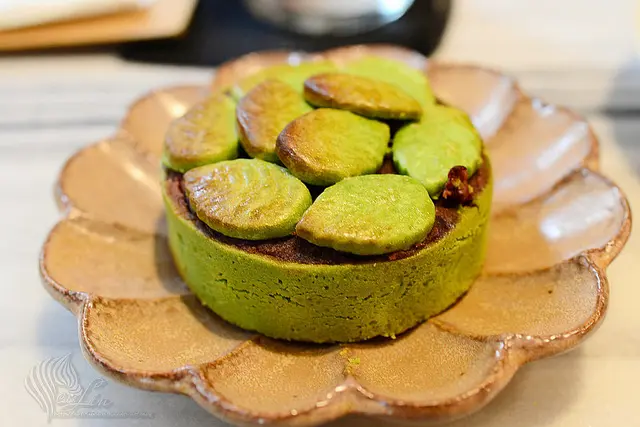 抹茶口味的塔皮,包滿細緻紅豆泥及Q彈軟嫩的白玉麻糬。 身為抹茶控,怎麼可能放過它不點呢?