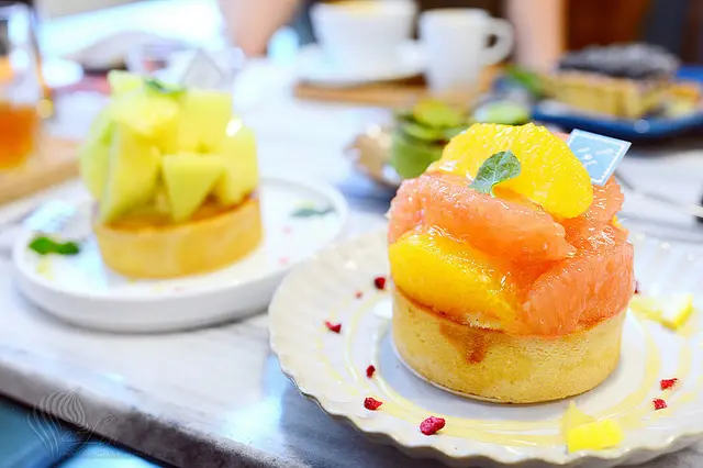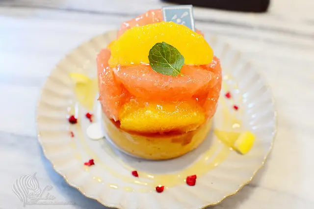 塔上將柳橙及葡萄柚搭配在一塊,柑橘的酸甜組合,無論視覺或味覺都很清新。 底下的塔內,也摻了些柑橘,整體都具有令人舒爽的香氣。