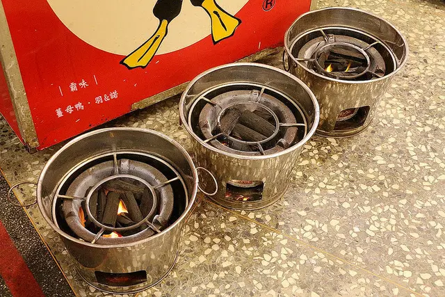 底下準備的木炭舊式待會上桌後煮薑母鴨用的