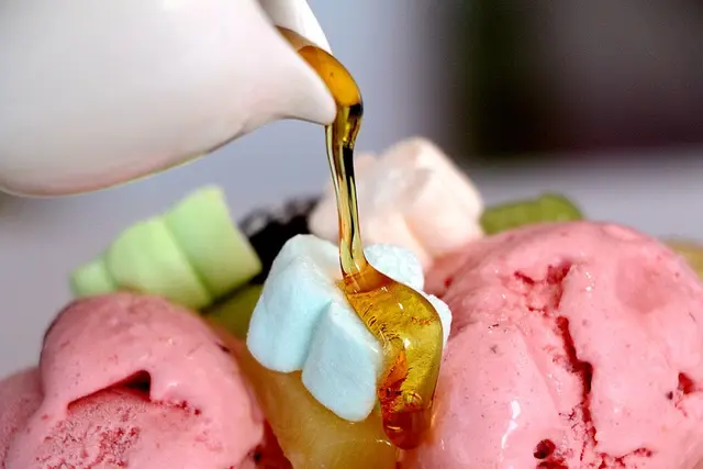 再放上草莓冰淇淋及棉花糖並淋上蜂蜜