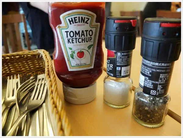 桌上擺有簡單的餐具還有調味品