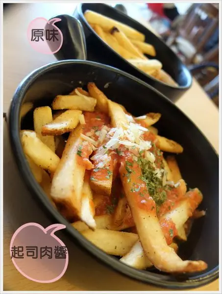 酥炸帶皮薯條(50元)起司肉醬薯條(60元)