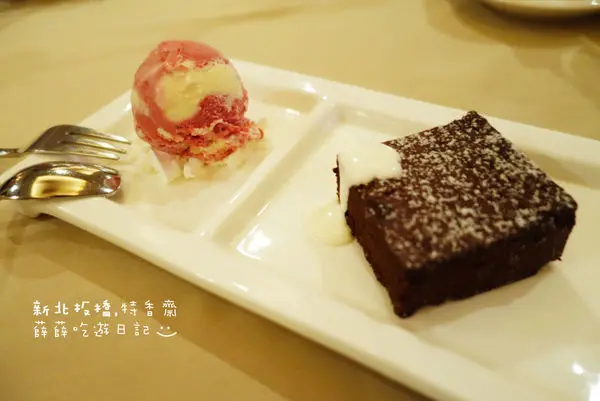 飯後甜點有三種,巧克力布朗尼、水果冰淇淋、提拉米蘇