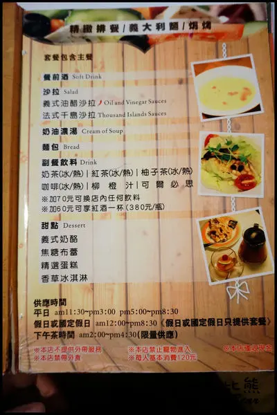 套餐包含餐前酒、沙拉、濃湯、麵包、副餐飲料、主餐、甜點
