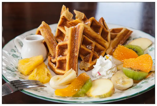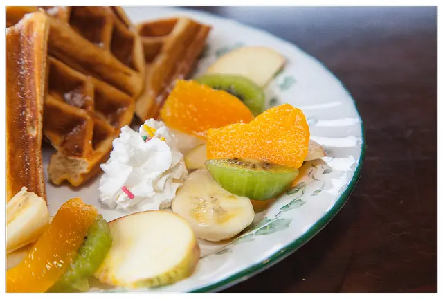 水果鬆餅是現烤的格子鬆餅,因此周六等待時間比較長一些約莫20分鐘,但與栗一樣點鬆餅的噗媽就比較早上來,應該是店家有特別注意每桌空擋時間。在這兒是圖個舒適的聚餐空間,因此鬆餅的味道只能說是中規中矩沒有太大特色,而且吃過列日鬆餅整個就回不去了,但值得稱讚的是水果都是現削。