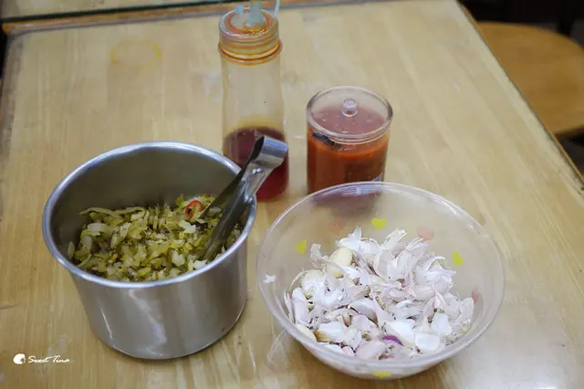 店內的醬料,除了辣油、辣椒、酸菜,竟然還有一大碗的蒜頭咧,真的就看到客人剝皮後搭配著吃,一定非常夠味!