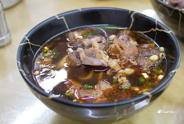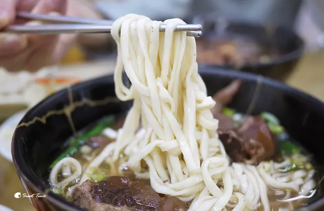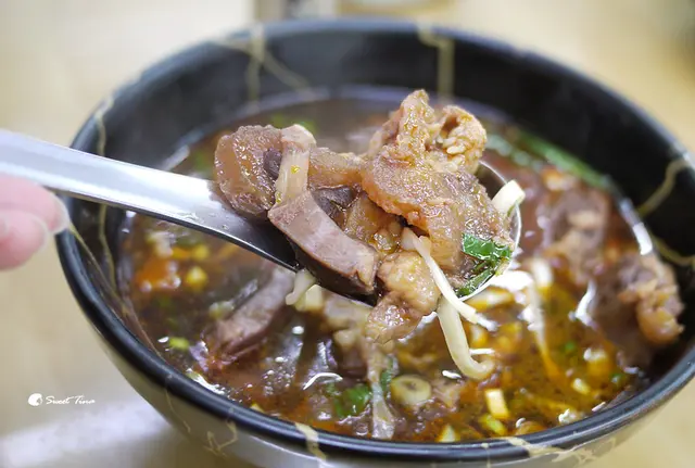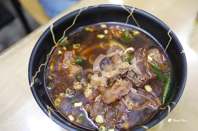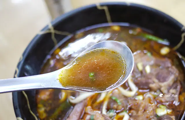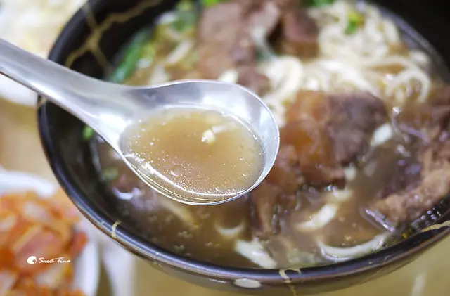 【紅燒半筋半肉牛肉麵】湯頭一樣非常濃郁,但辣度不高,屬於微辣的紅燒湯,吃起來還滿舒服的,如果喜歡較重口味的朋友,可自行加辣椒或辣油哦!