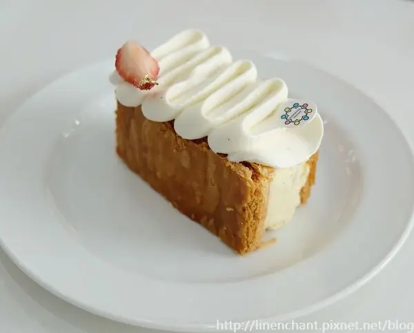 上層的鮮奶油不會膩,卡士達醬裡有滿滿香草籽~搭配著草莓一起吃,是很討喜的草莓千層唷!!!