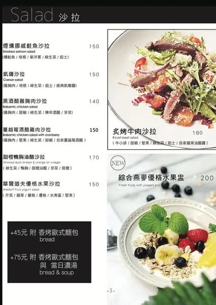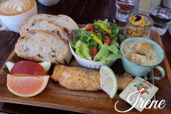 裡面包含了義式麵包、檸檬鮭魚、沙拉、湯、水果、優格、果醬
