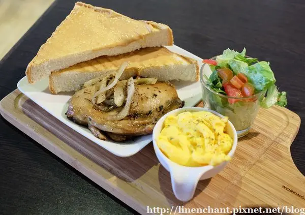 餐點裡還包含了沙拉、炒蛋、青醬洋蔥烤雞以及我選了花生醬烤吐司!!
